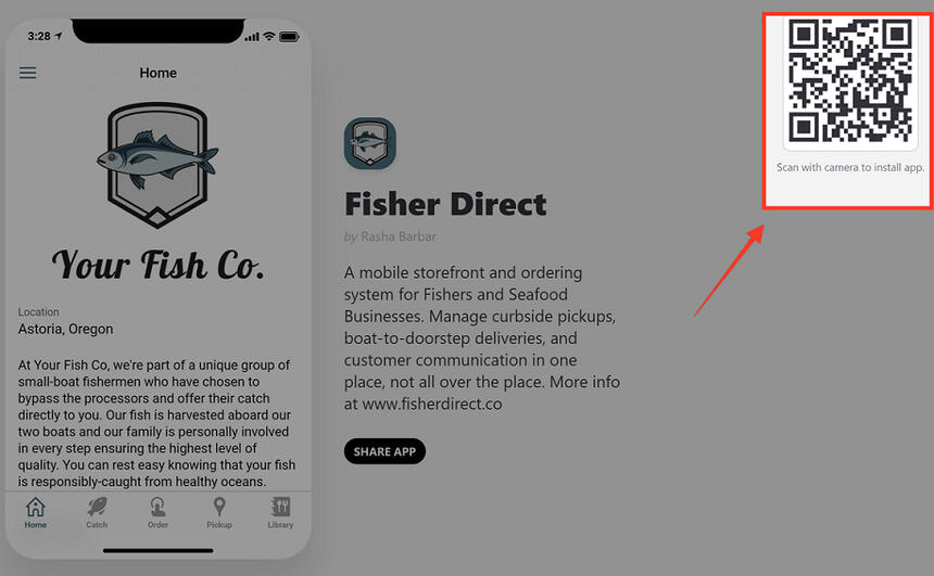 In the coming weeks, we'll be featuring fishers and businesses that launch a Fisher Direct app in an interactive directory (in progress). Your app's QR code will be front-and-center. A consumer who zeros-in on your business can scan it and connect with you straight away.